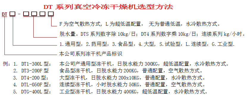 為方便用戶選型,DT系列冷凍干燥機按不同干燥對象和不同用途劃分為六個子系列,分別為DT1通用系列(一體機)、DT2藥用系列(一體機)、DT3食品系列(分體機)、DT4大型系列(分體機)、DTL連續系列(無人一體機)和DTG工業系列。每個系列按脫水量分為6個規格型號,每個規格型號按制冷配置分普通型和超低溫型,按殼體材質分碳鋼型和不繡鋼型,共約140多種規格型號可供選擇。